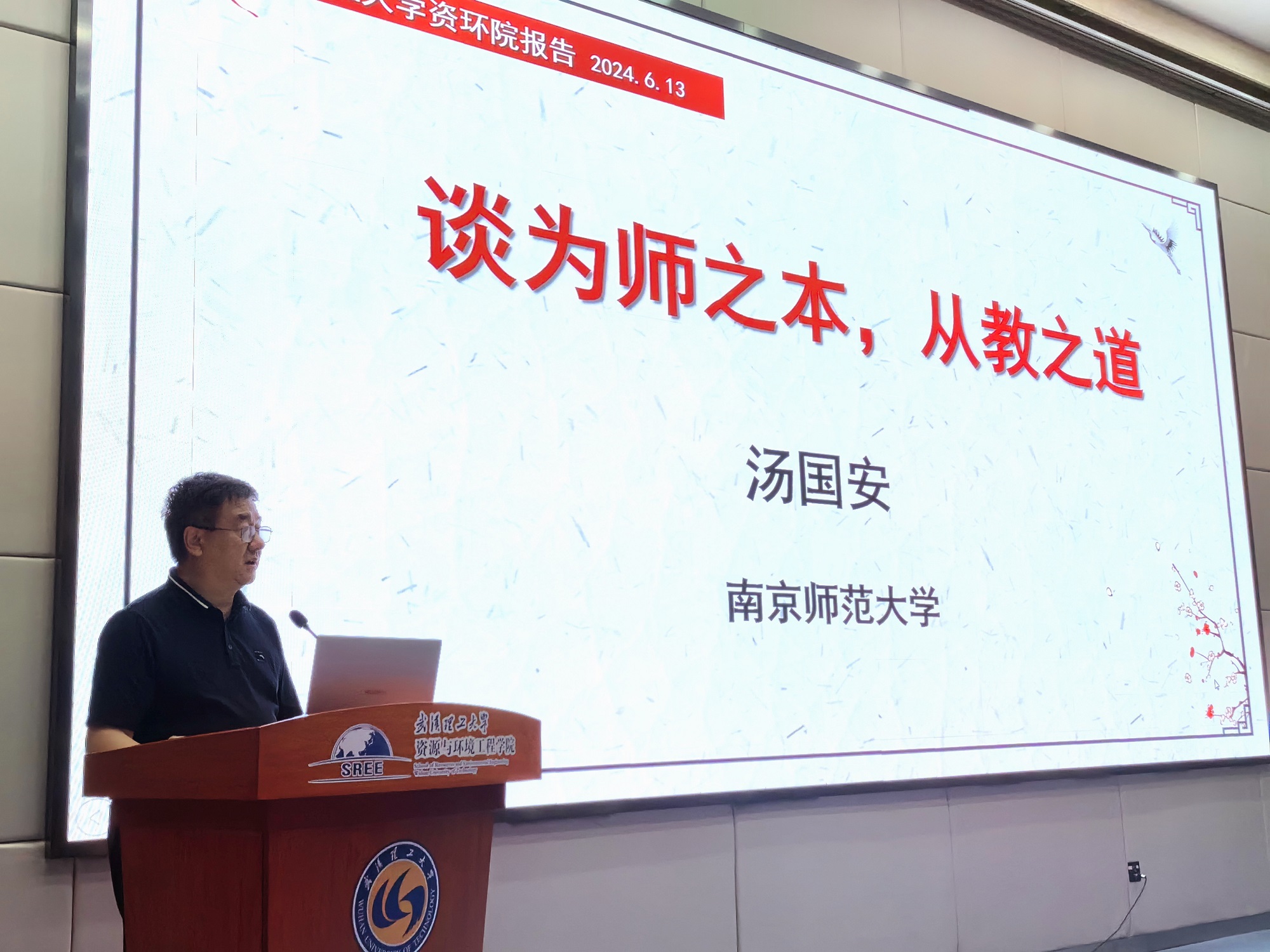 6月13日下午,资环学院邀请教育部高校“黄大年式教师团队”带头人、教育部课程思政名师、全国模范教师、南京师范大学汤国安教授做客“师德讲坛”暨导师培训会,面向全院教职工开展师德师风及育人经验交流,活动是学院“爱教·善教·荣教”师德教育系列活动及研究生导师培训的重要组成部分,是学院落实学校教育家精神弘扬践行培育行动的重要一环。活动由学院院长包申旭主持。