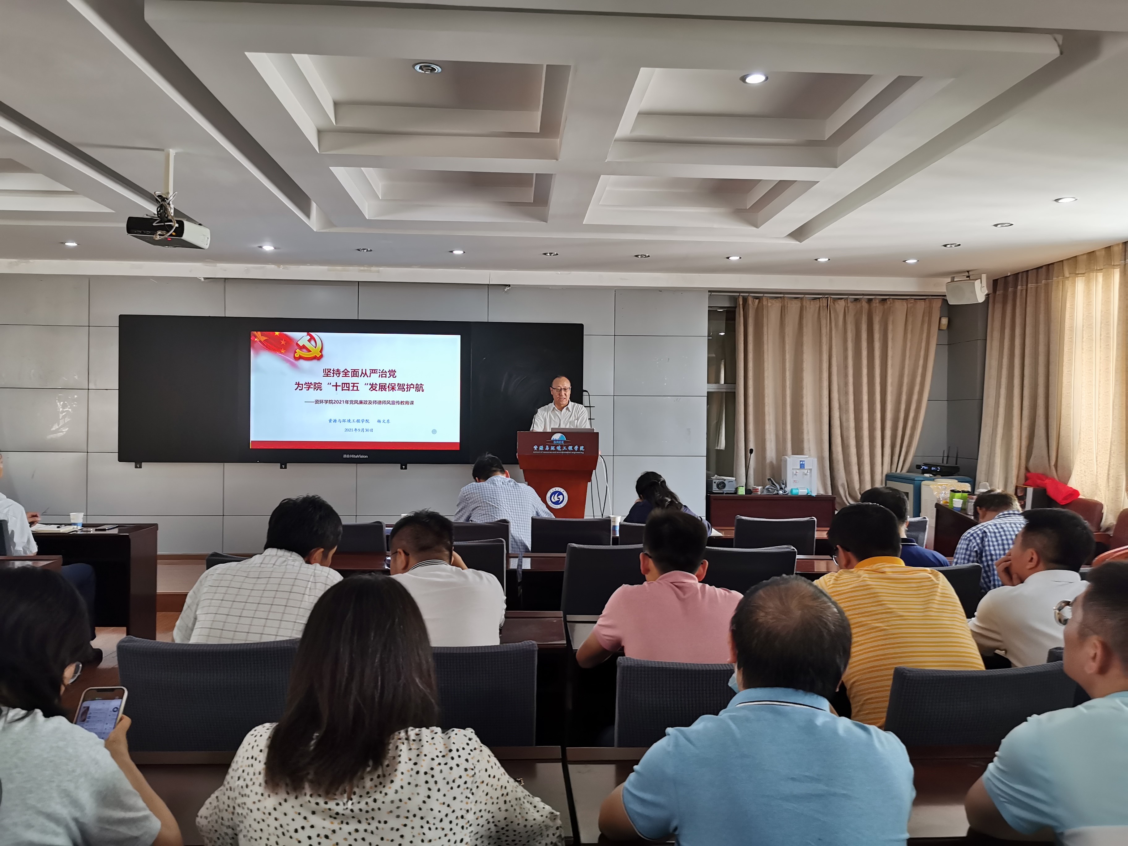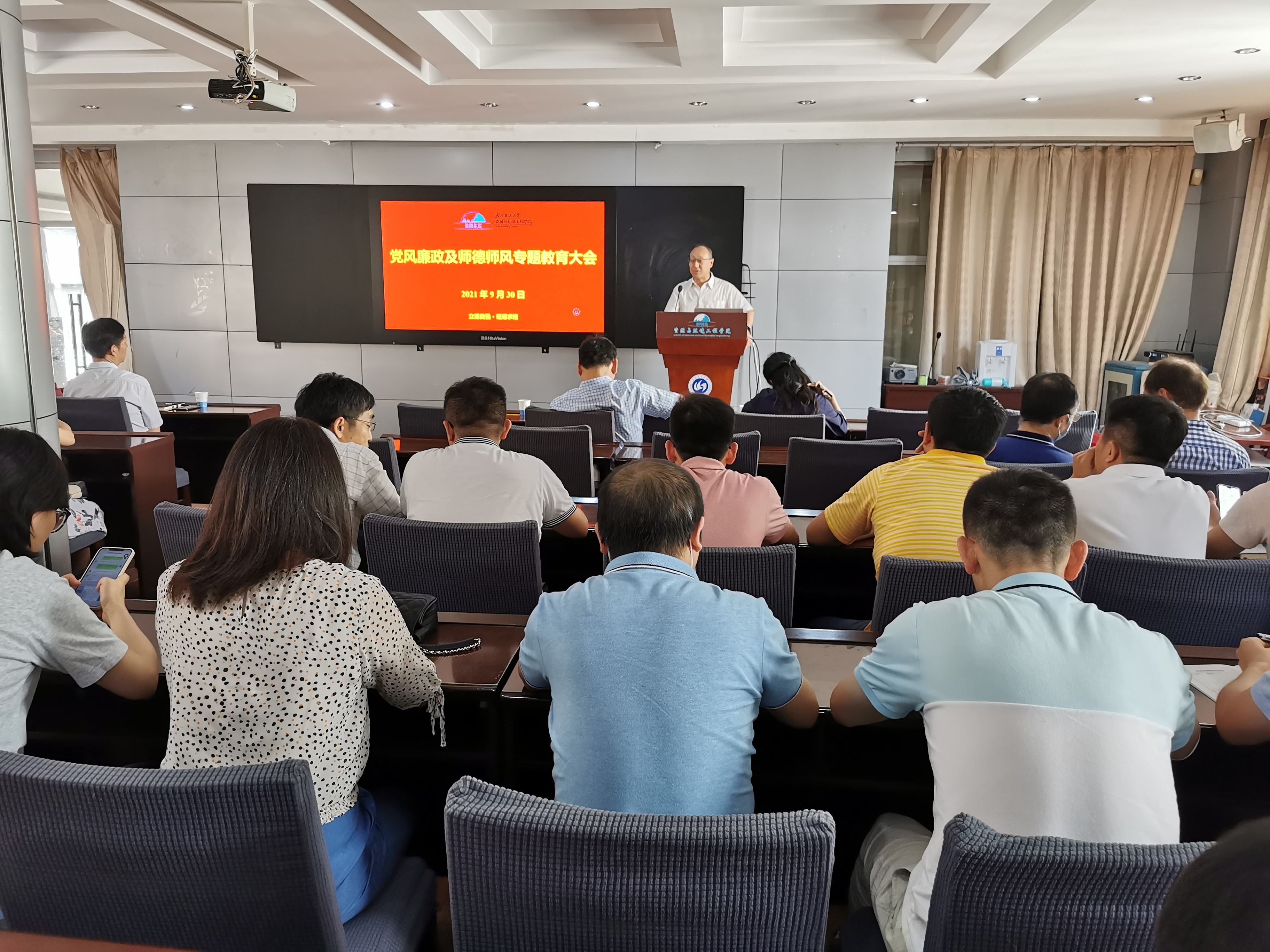 为推动党史学习教育走深走实,进一步强化党风廉政教育及师德教育,筑牢廉洁和师德思想防线,9月30日下午,资源与环境工程学院在三楼学术报告厅召开党风廉政及师德师风宣传教育大会。资环学院全体教职工参加会议,报告会由院党委书记杨文东主持。