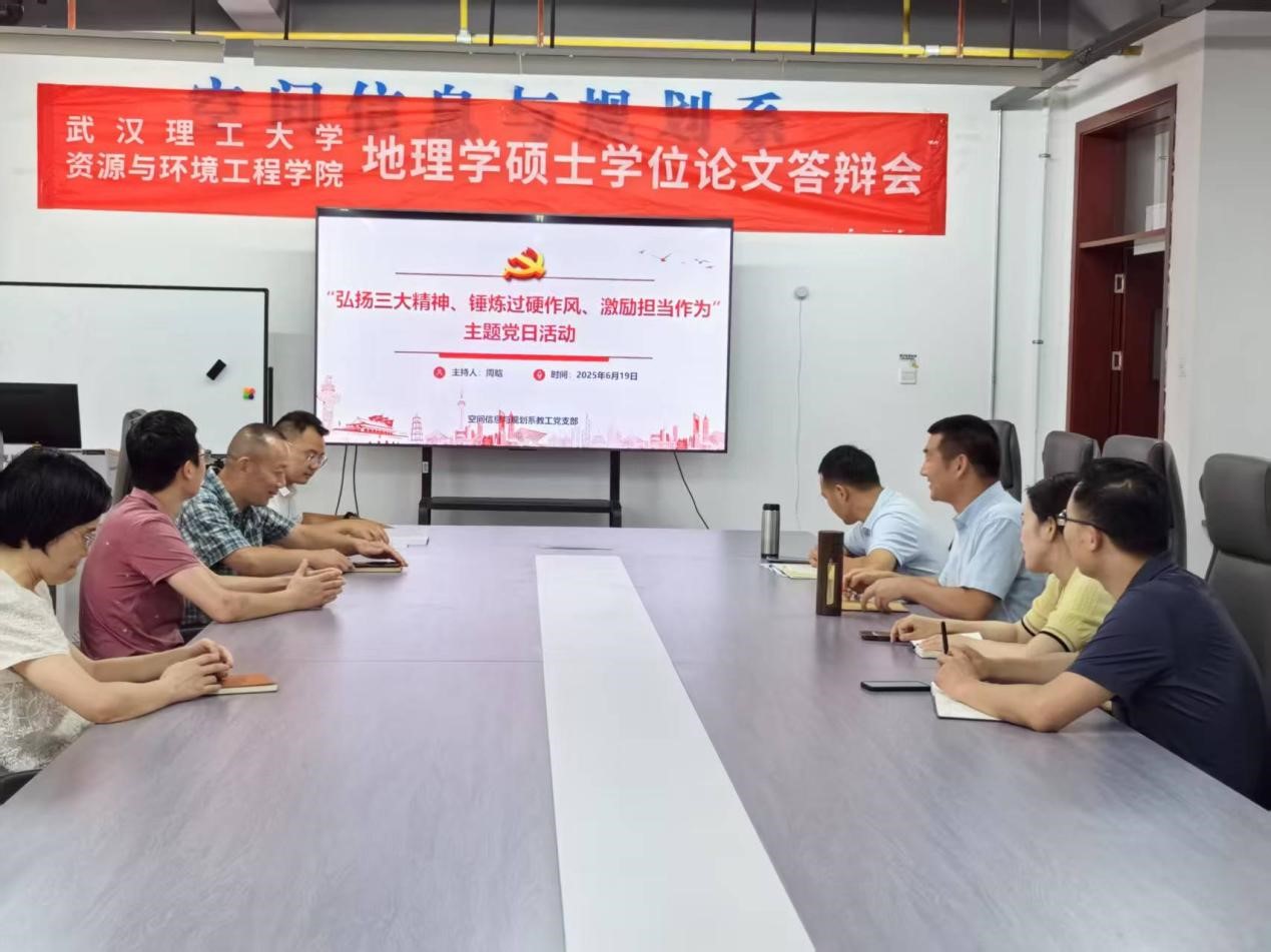 2025年6月19日,武汉理工大学空间信息与规划系教工党支部在周晗同志的主持下,开展了以“弘扬三大精神、锤炼过硬作风、激励担当作为”为主题的党日活动。