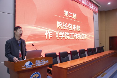 包申旭院长在会上回顾总结了2022年度学院在学科建设、本科教学、科学研究、人才培养、特色党建、学生工作以及社会合作与校友工作等多个方面取得的成绩,针对存在的问题,提出了学院2023年的工作目标任务和发展思路、发展举措和发展方向。