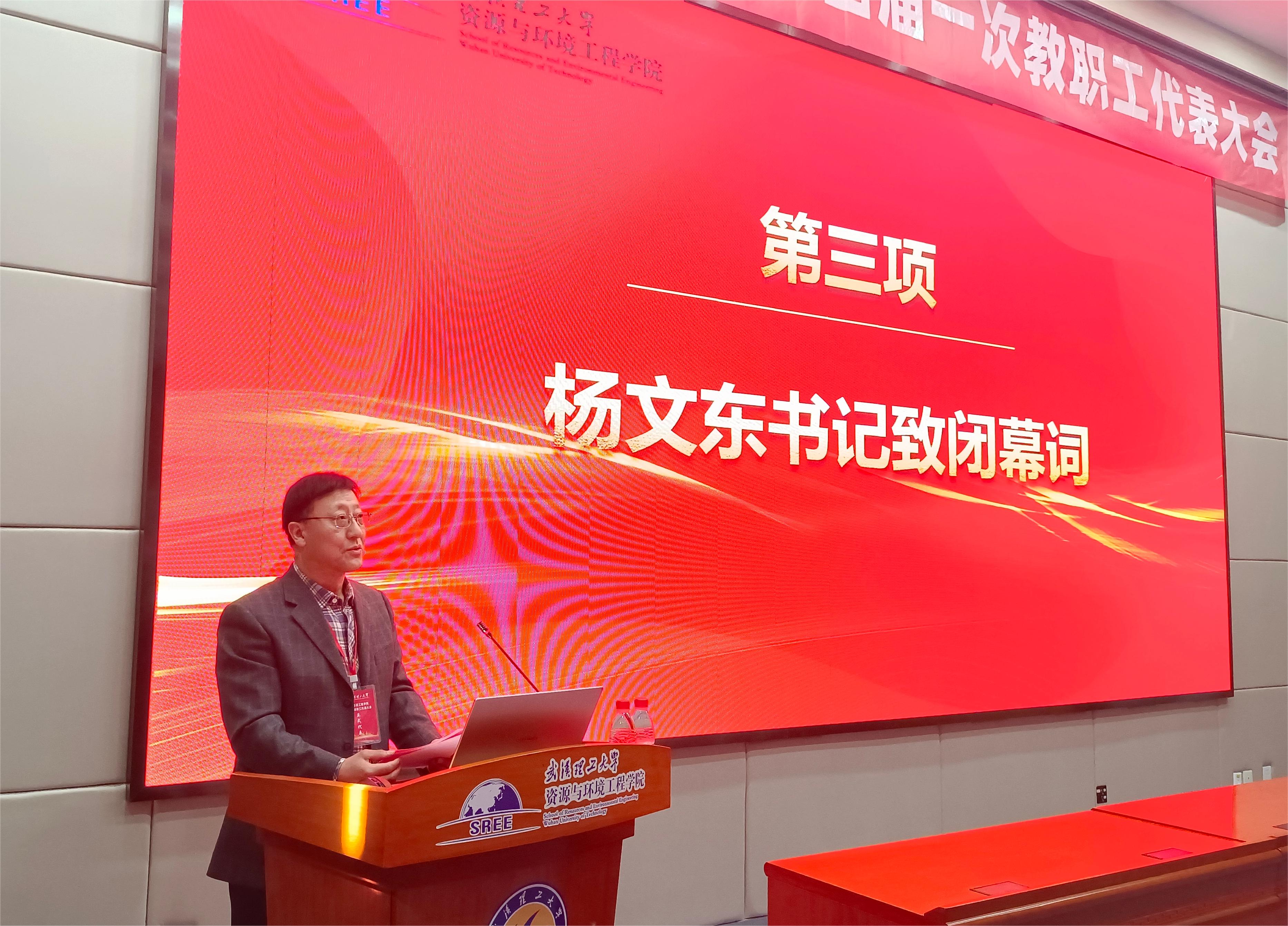 学院党委书记杨文东致闭幕词。他首先代表学校党委对大会的成功举行表示热烈的祝贺,他指出,资环学院四届一次教代会在全体代表、工作人员的共同努力下,圆满完成各项议程,对大家的辛勤付出致以衷心的感谢!