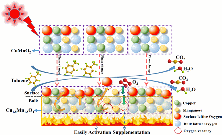 受此启发,武汉理工大学张高科教授课题组通过光驱动双金属铜锰氧化物(CuMnO2)结构重构的新颖方法,构建了具有优异光吸收和热转化能力的尖晶石结构的Cu1.5Mn1.5O4光热催化剂,其具有高效光热矿化空气中甲苯的性能。该研究首先通过低温水热方法制备Cu1.5Mn1.5O4的前驱体(CuMnO2),然后在氙灯的照射下将CuMnO2原位转化为Cu1.5Mn1.5O4,并直接用于空气中甲苯的光热矿化。材料表征和数据分析结果表明,从CuMnO2原位转化为Cu1.5Mn1.5O4的过程增强了Cu1.5Mn1.5O4的光吸收和热转化能力。在350 mW/cm2的光强照射下,Cu1.5Mn1.5O4光热催化剂对低浓度的甲苯(200ppm)具有高效的去除能力(98%的甲苯转化率和85%的CO2生成率)。机理研究表明,Cu1.5Mn1.5O4优异的光吸收和热转化能力以及易于活化的表面晶格氧是其高效光热矿化VOCs的关键。Cu1.5Mn1.5O4强的光吸收和热转化能力有利于其表面局部温度的迅速升高,促使Cu1.5Mn1.5O4的表面晶格氧在高温驱动下更容易活化成活性氧物种并形成氧空位,同时气态氧填补Cu1.5Mn1.5O4的氧空位(图1)。该反应过程有利于甲苯的高效深度氧化。该研究为通过原位光热结构重构制备光热催化剂并直接用于VOCs的高效矿化提供了新的思路。