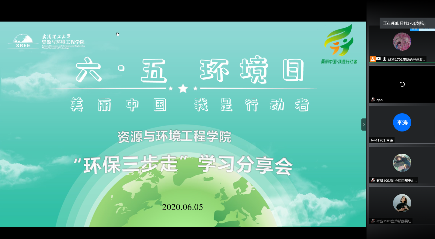 2020年6月5日,是全球第49个世界环境日。资环学院结合我国6·5环境日“美丽中国,我是行动者”的环保主题,紧紧围绕学院专业特色,开展6·5环境日之“环保三步走”系列线上交流学习活动,学院200余名师生参与。
