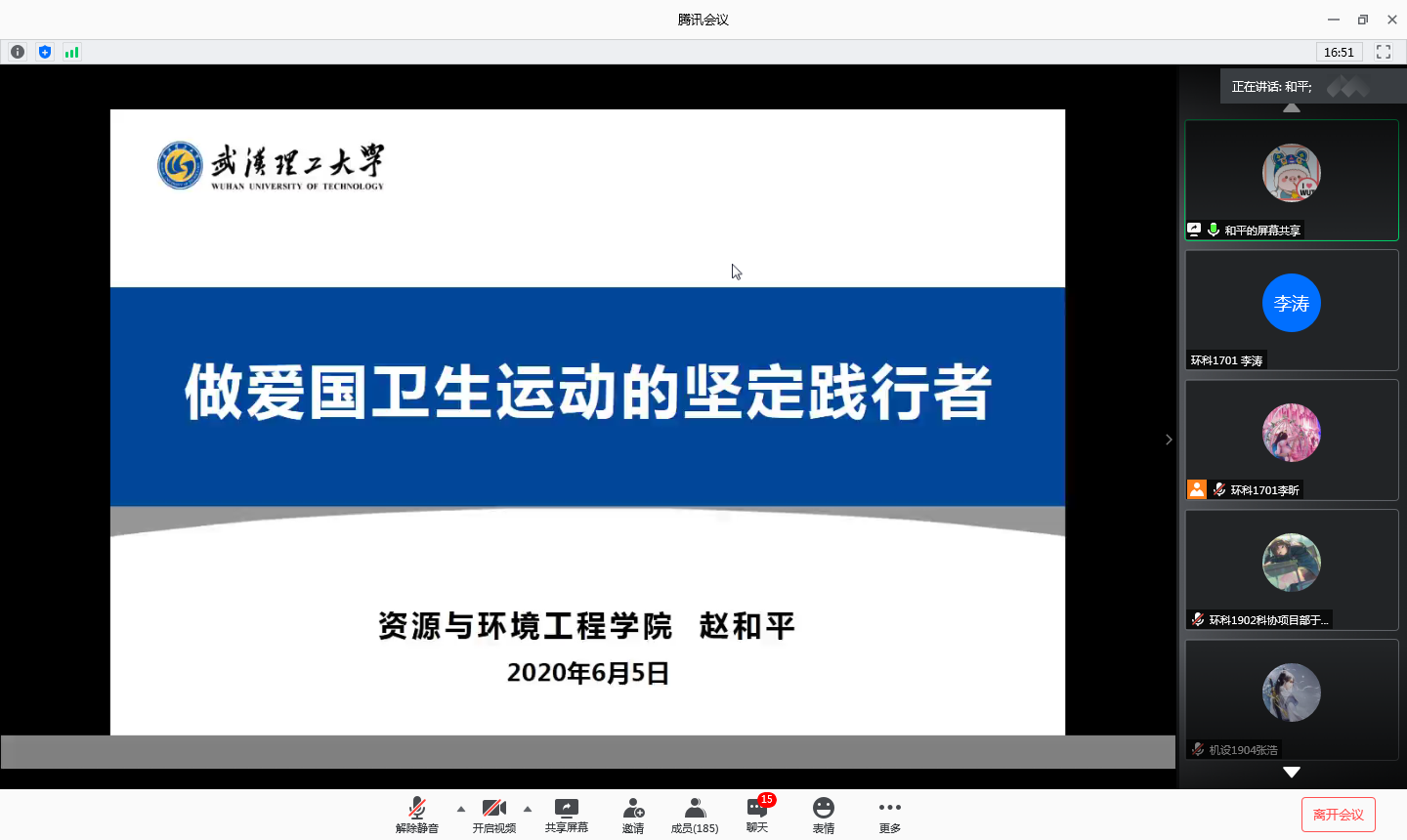 院团委书记赵和平老师做了以“做爱国卫生运动的坚定践行者”为主题的讲座。赵老师从爱国卫生运动的历史起源讲起,分享了我国开展的一系列与爱国卫生运动有关的活动,展示其历史底蕴,并将爱国卫生运动分为公共卫生、生活卫生、身心卫生三个推进载体,分别就自我认知,自我管理,自我体验三个方面展开介绍,展示了我院各学生积极组织开展的与环境保护、卫生文明、心理健康有关的各项特色活动,将爱国情怀与卫生健康意识结合,体现出将卫生健康观念融入到日常行动当中的重要性。