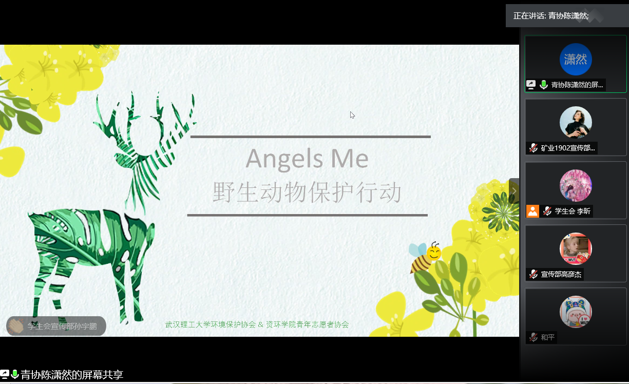 青年志愿者协会陈潇然同学则为同学们介绍了我校环境保护协会与我院青年志愿者协会共同开展的“Angels Me”野生动物保护专项行动,阐述活动的具体流程,展示活动的积极意义。她表示,“Angels Me”,意为“守护我”,既是爱护野生动物,也是保护人类自己。希望大家关注学校及学院开展的各项有关保护环境和野生动物的知识宣讲和特色活动,积极参与其中,用爱保护野生动物,用行动践行绿色发展理念。