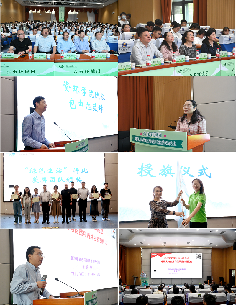 启动仪式上,开场视频总结了学院围绕纪念“六五环境日”主题于5月份开展的各类环保教育实践活动,活动现场资环学院院长包申旭致辞、校团委副书记汪茜发表讲话,与会嘉宾、学生深入了解了资环学院学科专业与“生态环境保护”的深厚历史渊源、22年以来持续开展纪念六五环境日主题教育活动的宝贵实践经验。南方测绘湖北分公司副总经理刘明春、学工部副部长石琳、资环学院副院长马中杰及学院环境系教师杨红刚、王珺婷为“绿色生活”评比获奖团队颁奖,国有资产与实验室管理处副处长陈华为“长江环保志愿服务队”授旗。紧接着,武汉市生态环境局武昌分局局长、资环学院环境工程2002届校友乐庆华作题为《践行习近平生态文明思想,建设人与自然和谐共生的现代化》的报告,现场反响热烈。最后,启动仪式在“六五环境日”主题歌曲《让中国更美丽》中圆满结束。