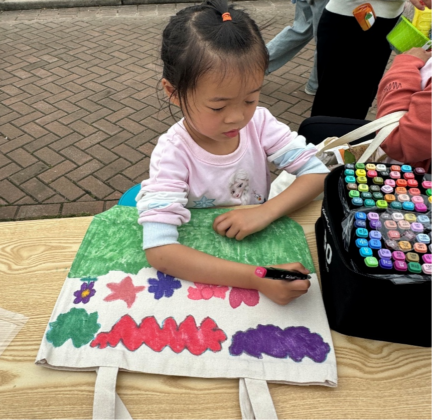 上午9时,越园食堂前的学生们准备好了待绘制的素白帆布袋。环境工程专业的志愿者们支起调色台,将矿物颜料分装成小巧的"地球色卡",向参与者讲解:"这些取自天然矿物的颜料,就像我们守护的自然资源,既环保又充满生命力。