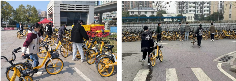 在南湖地下通道、食堂以及教学楼等共享单车聚集较多的地方也有着资环学子的身影,学院各研究生党支部于3月16日、17日开展共享单车摆放活动。在活动现场,志愿者们投入十分的热情与耐心,有的负责搬运单车、有的负责将单车摆放整齐、有的负责引导同学规范停车。党建引领聚合力,在同学们的共同努力下,原本杂乱无章的单车变得井然有序,成为了校园一道亮丽的风景线,为广大师生提供了更加便捷的出行条件。本次活动,旨在进一步提高同学们对共享单车摆放乱象的关注,倡导文明骑行、规范停放的和谐校园理念。