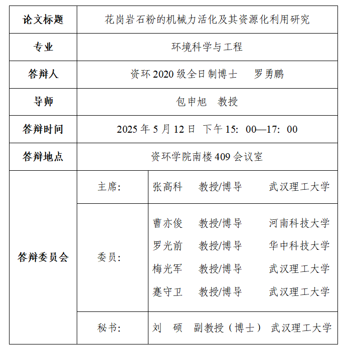 【资环学院】博士罗勇鹏学位论文答辩公告