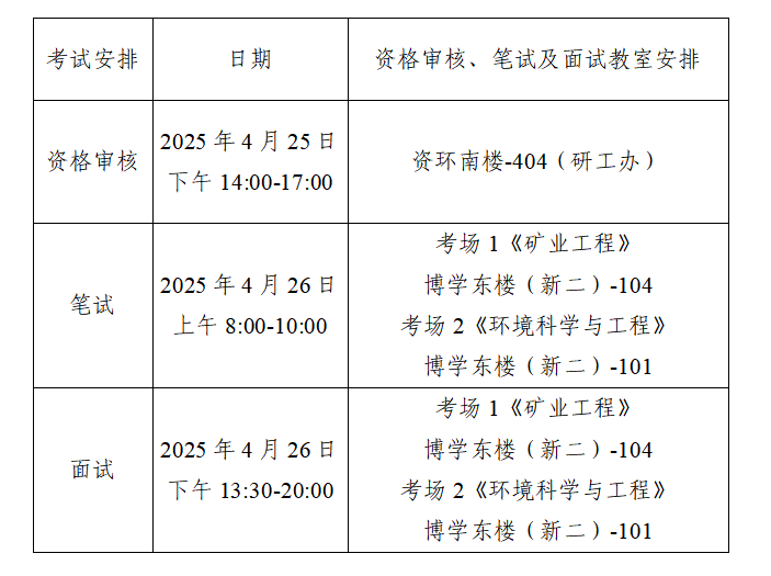 说明:对于申请免笔试的考生,学院将按《资源与环境工程学院2025年博士研究生“申请—考核”制招生方案》严格审核,通过者可直接进入面试环节。